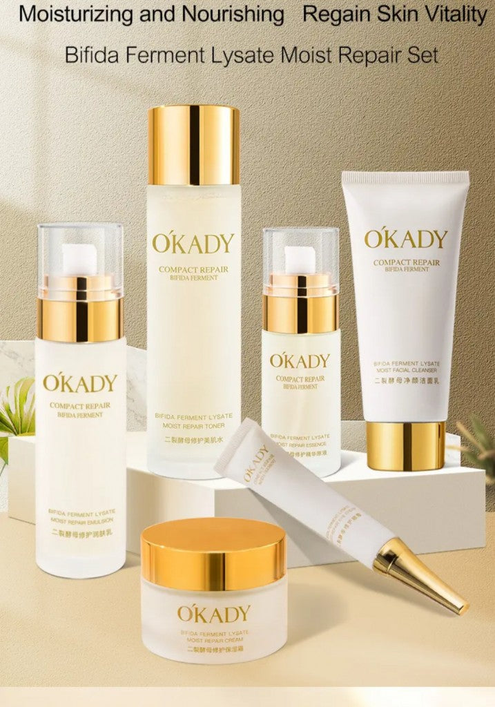 O'KADY Bifidobacterium Gefermenteerde Lysate Hydraterende Reparatieset】 Gezichtsreiniger :100g; Reparatietoner :120ml; Reparatielotion :100ml; Reparatie-essence :40ml; Reparatiecrème :50g: Reparatieoogcrème :15g